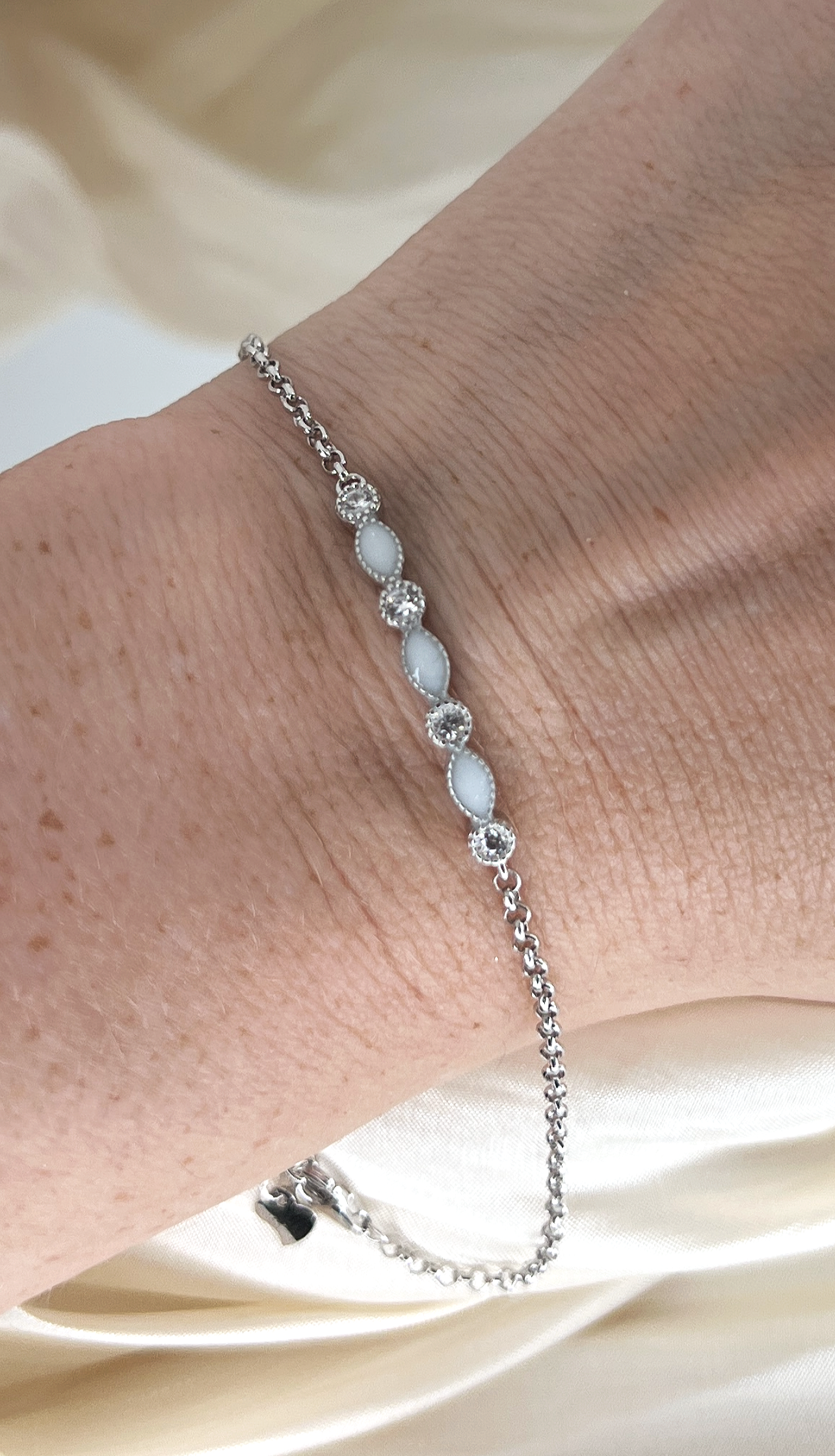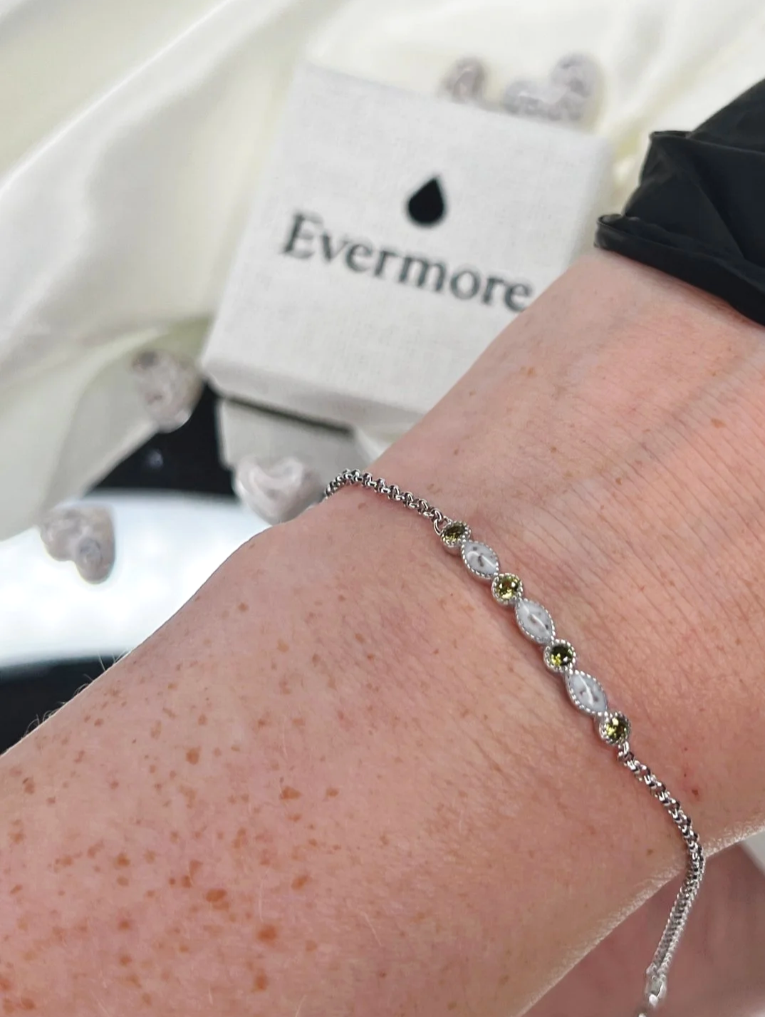 Delicate, feminine, and full of quiet meaning. The phoenix Bracelet is crafted in sterling silver and features an oval keepsake stone framed by a vine of glistening leaves. A symbol of connection, resilience, and eternal love.